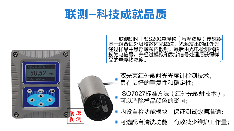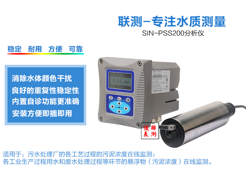 SIN-PSS200傳感器基于組合紅外吸收散射光線(xiàn)法,應(yīng)用ISO7027方法可以連續(xù)測(cè)定污泥濃度。按照ISO7027紅外雙散射光線(xiàn)技術(shù)不受色度影響測(cè)定污泥濃度值。根據(jù)使用環(huán)境可以選配帶自清洗功能。數(shù)據(jù)穩(wěn)定,性能可靠;內(nèi)設(shè)自診功能,保證數(shù)據(jù)準(zhǔn)確;安裝和校正簡(jiǎn)單。